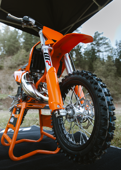 Rolling off the race rig and into the pit lane, the KTM 50 SX uses lightweight, black anodized, aluminum rims just like the full-size KTM SX range. These provide the highest levels of strength and reliability, while MAXXIS MX-ST tires deliver outstanding performance on any terrain, along with exceptional straight-line stability.